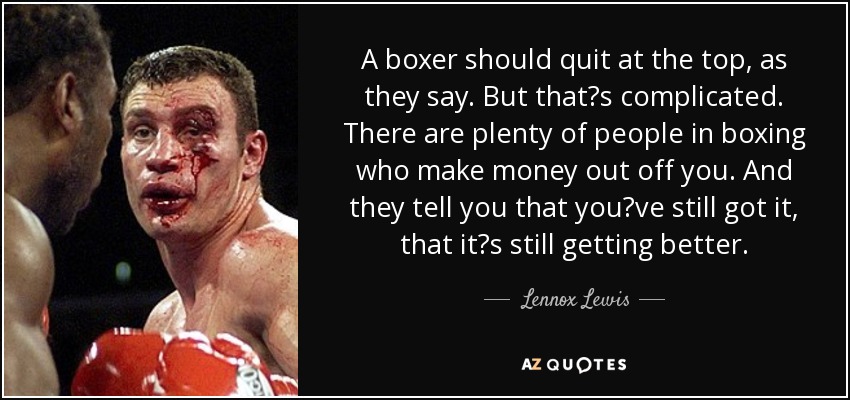 A boxer should quit at the top, as they say. But thats complicated. There are plenty of people in boxing who make money out off you. And they tell you that youve still got it, that its still getting better.
