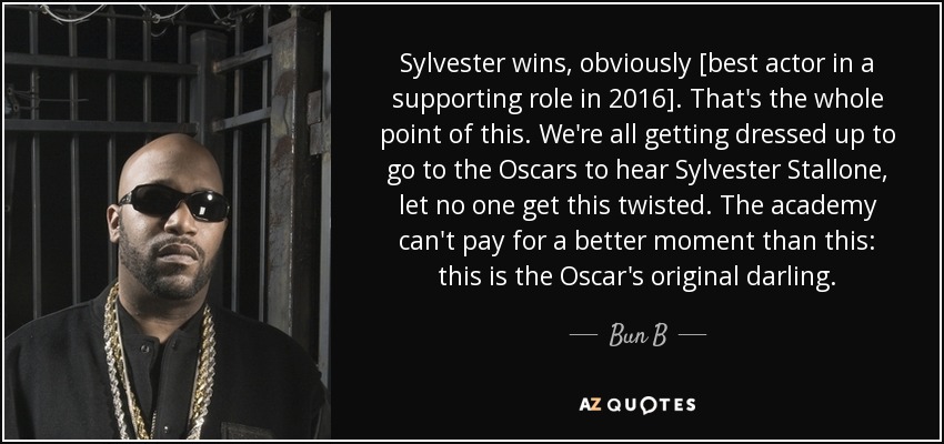 Sylvester wins, obviously [best actor in a supporting role in 2016]. That's the whole point of this. We're all getting dressed up to go to the Oscars to hear Sylvester Stallone, let no one get this twisted. The academy can't pay for a better moment than this: this is the Oscar's original darling.