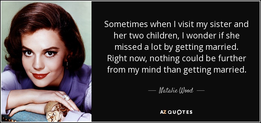 Sometimes when I visit my sister and her two children, I wonder if she missed a lot by getting married. Right now, nothing could be further from my mind than getting married.