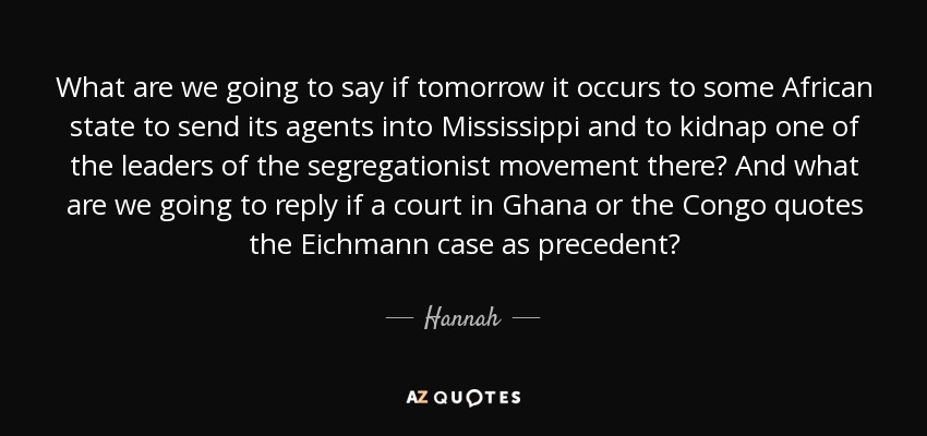 What are we going to say if tomorrow it occurs to some African state to send its agents into Mississippi and to kidnap one of the leaders of the segregationist movement there? And what are we going to reply if a court in Ghana or the Congo quotes the Eichmann case as precedent?
