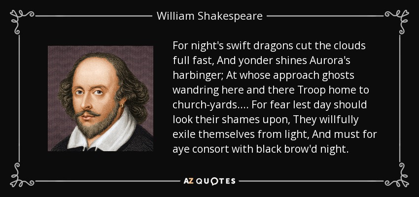 For night's swift dragons cut the clouds full fast, And yonder shines Aurora's harbinger; At whose approach ghosts wandring here and there Troop home to church-yards.... For fear lest day should look their shames upon, They willfully exile themselves from light, And must for aye consort with black brow'd night.
