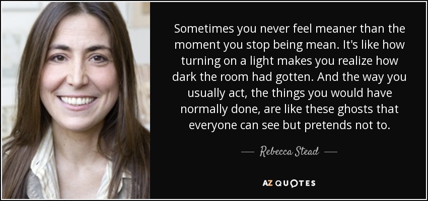 Sometimes you never feel meaner than the moment you stop being mean. It's like how turning on a light makes you realize how dark the room had gotten. And the way you usually act, the things you would have normally done, are like these ghosts that everyone can see but pretends not to.