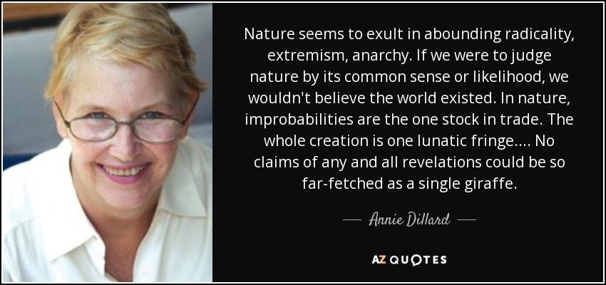 Nature seems to exult in abounding radicality, extremism, anarchy. If we were to judge nature by its common sense or likelihood, we wouldn't believe the world existed. In nature, improbabilities are the one stock in trade. The whole creation is one lunatic fringe. ... No claims of any and all revelations could be so far-fetched as a single giraffe.