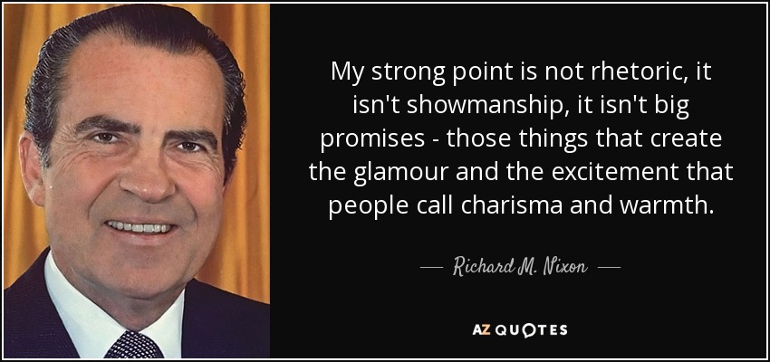 My strong point is not rhetoric , it isn't showmanship, it isn't big promises - those things that create the glamour and the excitement that people call charisma and warmth.