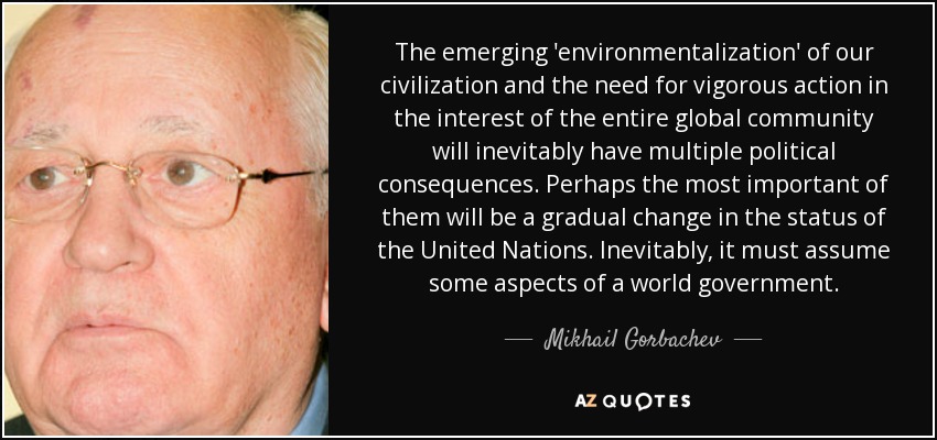 The emerging 'environmentalization' of our civilization and the need for vigorous action in the interest of the entire global community will inevitably have multiple political consequences. Perhaps the most important of them will be a gradual change in the status of the United Nations. Inevitably, it must assume some aspects of a world government.