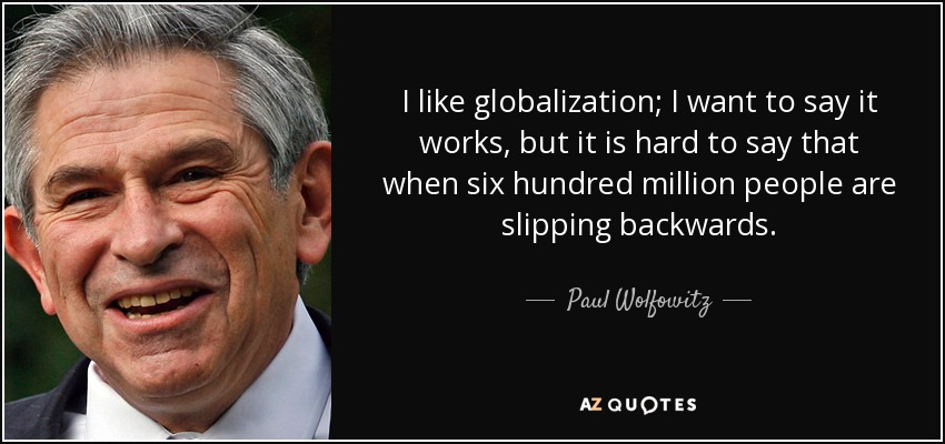 I like globalization; I want to say it works, but it is hard to say that when six hundred million people are slipping backwards.