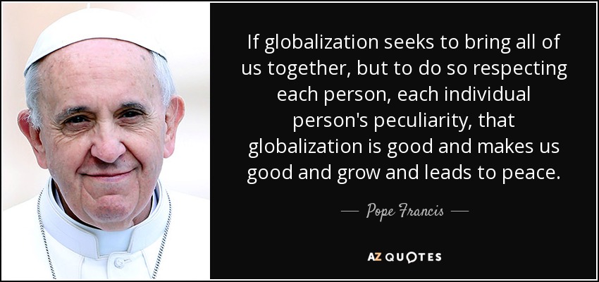 If globalization seeks to bring all of us together, but to do so respecting each person, each individual person's peculiarity, that globalization is good and makes us good and grow and leads to peace.