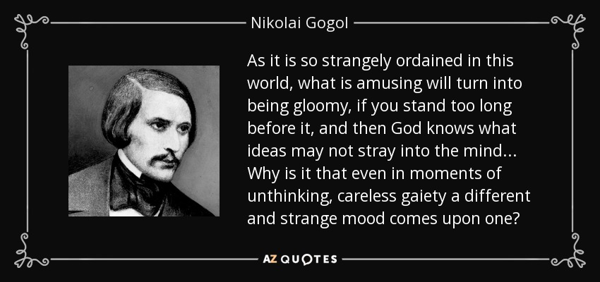 As it is so strangely ordained in this world, what is amusing will turn into being gloomy, if you stand too long before it, and then God knows what ideas may not stray into the mind... Why is it that even in moments of unthinking, careless gaiety a different and strange mood comes upon one?