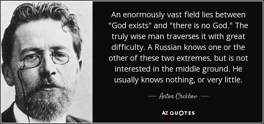 An enormously vast field lies between "God exists" and "there is no God." The truly wise man traverses it with great difficulty. A Russian knows one or the other of these two extremes, but is not interested in the middle ground. He usually knows nothing, or very little.