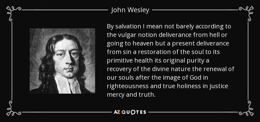 By salvation I mean not barely according to the vulgar notion deliverance from hell or going to heaven but a present deliverance from sin a restoration of the soul to its primitive health its original purity a recovery of the divine nature the renewal of our souls after the image of God in righteousness and true holiness in justice mercy and truth.