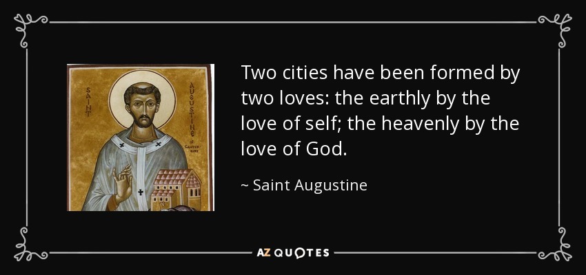 Two cities have been formed by two loves: the earthly by the love of self; the heavenly by the love of God.
