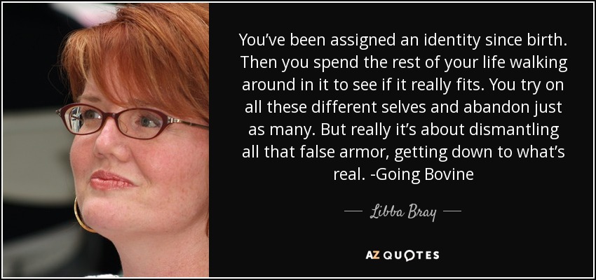 You’ve been assigned an identity since birth. Then you spend the rest of your life walking around in it to see if it really fits. You try on all these different selves and abandon just as many. But really it’s about dismantling all that false armor, getting down to what’s real. -Going Bovine