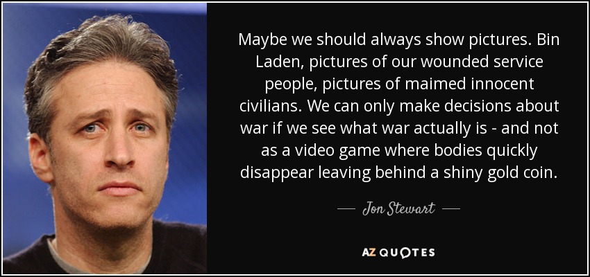 Maybe we should always show pictures. Bin Laden, pictures of our wounded service people, pictures of maimed innocent civilians. We can only make decisions about war if we see what war actually is - and not as a video game where bodies quickly disappear leaving behind a shiny gold coin.