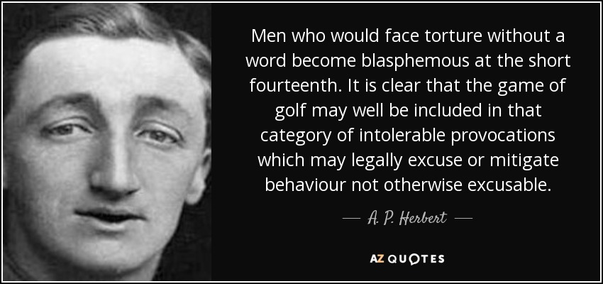 Men who would face torture without a word become blasphemous at the short fourteenth. It is clear that the game of golf may well be included in that category of intolerable provocations which may legally excuse or mitigate behaviour not otherwise excusable.