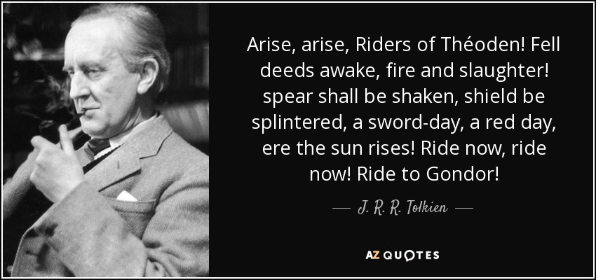Arise, arise, Riders of Théoden! Fell deeds awake, fire and slaughter! spear shall be shaken, shield be splintered, a sword-day, a red day, ere the sun rises! Ride now, ride now! Ride to Gondor!