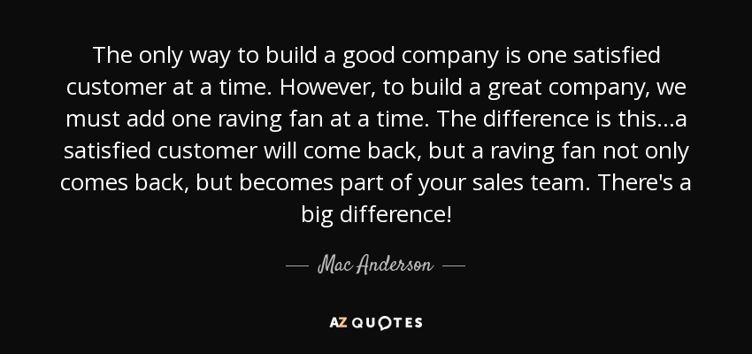 The only way to build a good company is one satisfied customer at a time. However, to build a great company, we must add one raving fan at a time. The difference is this...a satisfied customer will come back, but a raving fan not only comes back, but becomes part of your sales team. There's a big difference!