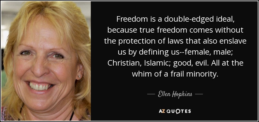 Freedom is a double-edged ideal, because true freedom comes without the protection of laws that also enslave us by defining us--female, male; Christian, Islamic; good, evil. All at the whim of a frail minority.