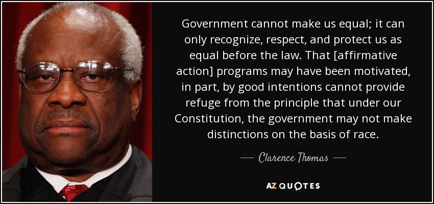 Government cannot make us equal; it can only recognize, respect, and protect us as equal before the law. That [affirmative action] programs may have been motivated, in part, by good intentions cannot provide refuge from the principle that under our Constitution, the government may not make distinctions on the basis of race.