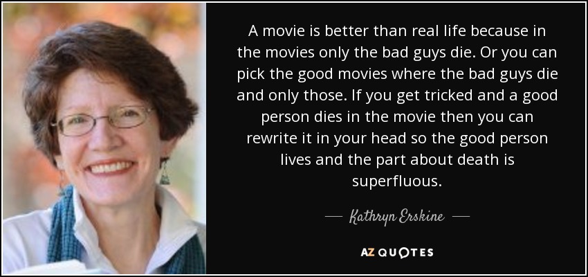 A movie is better than real life because in the movies only the bad guys die. Or you can pick the good movies where the bad guys die and only those. If you get tricked and a good person dies in the movie then you can rewrite it in your head so the good person lives and the part about death is superfluous.