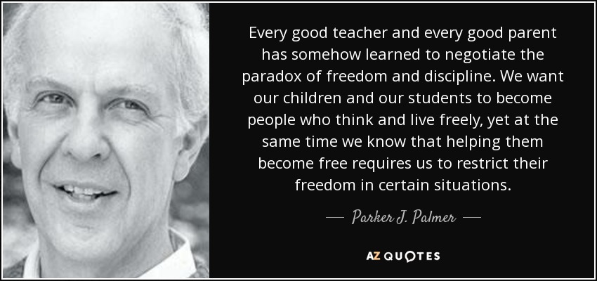 Every good teacher and every good parent has somehow learned to negotiate the paradox of freedom and discipline. We want our children and our students to become people who think and live freely, yet at the same time we know that helping them become free requires us to restrict their freedom in certain situations.