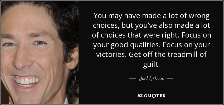 You may have made a lot of wrong choices, but you’ve also made a lot of choices that were right. Focus on your good qualities. Focus on your victories. Get off the treadmill of guilt.