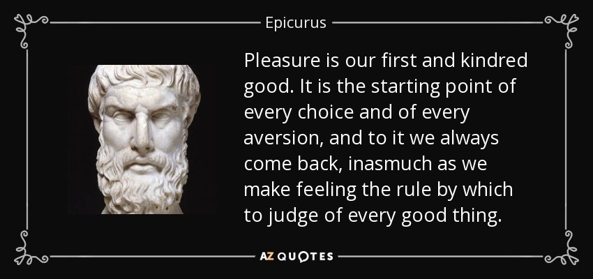 Pleasure is our first and kindred good. It is the starting point of every choice and of every aversion, and to it we always come back, inasmuch as we make feeling the rule by which to judge of every good thing.