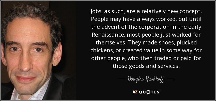 Jobs, as such, are a relatively new concept. People may have always worked, but until the advent of the corporation in the early Renaissance, most people just worked for themselves. They made shoes, plucked chickens, or created value in some way for other people, who then traded or paid for those goods and services.