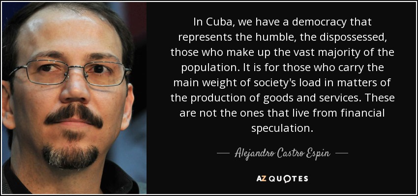In Cuba, we have a democracy that represents the humble, the dispossessed, those who make up the vast majority of the population. It is for those who carry the main weight of society's load in matters of the production of goods and services. These are not the ones that live from financial speculation.