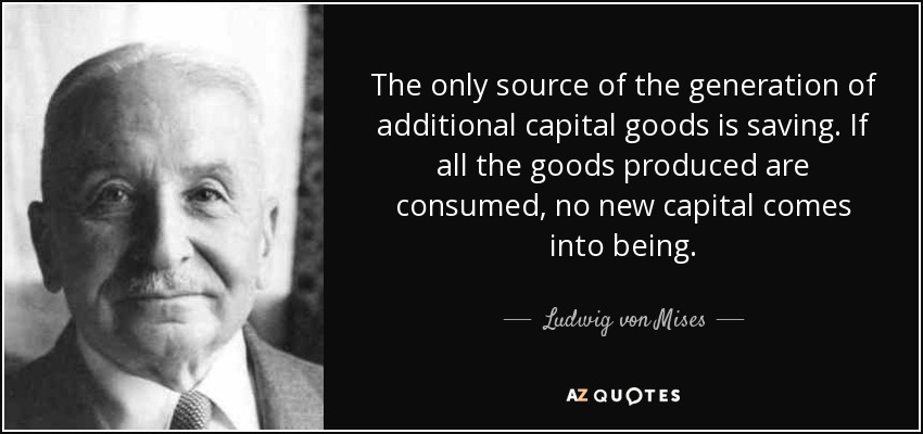 The only source of the generation of additional capital goods is saving. If all the goods produced are consumed, no new capital comes into being.