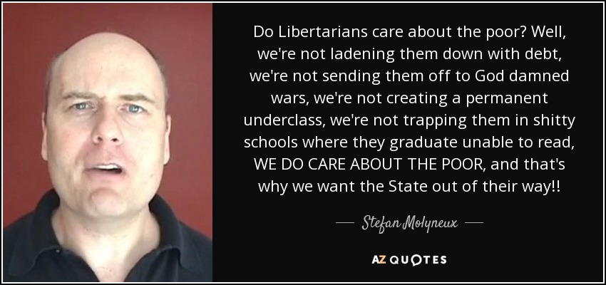 Do Libertarians care about the poor? Well, we're not ladening them down with debt, we're not sending them off to God damned wars, we're not creating a permanent underclass, we're not trapping them in shitty schools where they graduate unable to read, WE DO CARE ABOUT THE POOR, and that's why we want the State out of their way!!