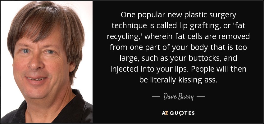 One popular new plastic surgery technique is called lip grafting, or 'fat recycling,' wherein fat cells are removed from one part of your body that is too large, such as your buttocks, and injected into your lips. People will then be literally kissing ass.