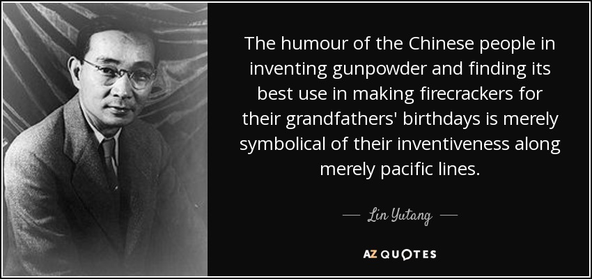 The humour of the Chinese people in inventing gunpowder and finding its best use in making firecrackers for their grandfathers' birthdays is merely symbolical of their inventiveness along merely pacific lines.