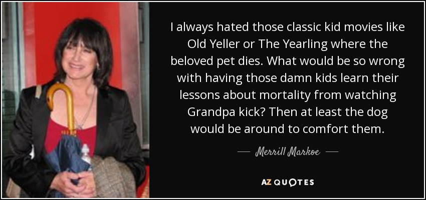 I always hated those classic kid movies like Old Yeller or The Yearling where the beloved pet dies. What would be so wrong with having those damn kids learn their lessons about mortality from watching Grandpa kick? Then at least the dog would be around to comfort them.