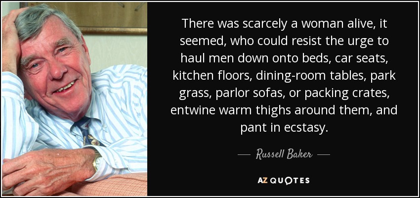 There was scarcely a woman alive, it seemed, who could resist the urge to haul men down onto beds, car seats, kitchen floors, dining-room tables, park grass, parlor sofas, or packing crates, entwine warm thighs around them, and pant in ecstasy.