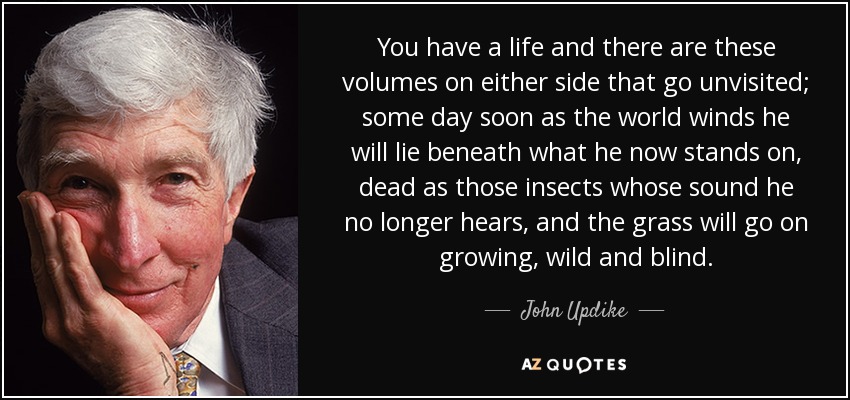 You have a life and there are these volumes on either side that go unvisited; some day soon as the world winds he will lie beneath what he now stands on, dead as those insects whose sound he no longer hears, and the grass will go on growing, wild and blind.