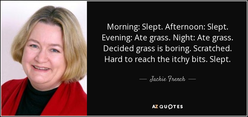 Morning: Slept. Afternoon: Slept. Evening: Ate grass. Night: Ate grass. Decided grass is boring. Scratched. Hard to reach the itchy bits. Slept.