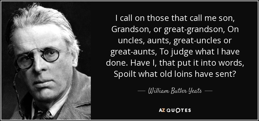 I call on those that call me son, Grandson, or great-grandson, On uncles, aunts, great-uncles or great-aunts, To judge what I have done. Have I, that put it into words, Spoilt what old loins have sent?