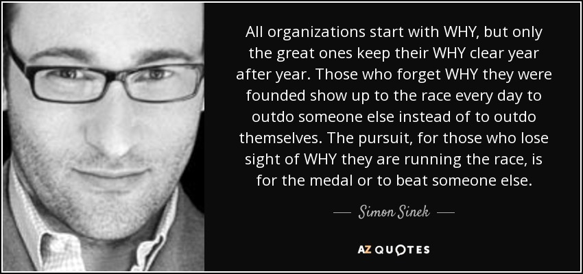 All organizations start with WHY, but only the great ones keep their WHY clear year after year. Those who forget WHY they were founded show up to the race every day to outdo someone else instead of to outdo themselves. The pursuit, for those who lose sight of WHY they are running the race, is for the medal or to beat someone else.