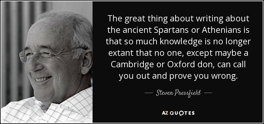 The great thing about writing about the ancient Spartans or Athenians is that so much knowledge is no longer extant that no one, except maybe a Cambridge or Oxford don, can call you out and prove you wrong.