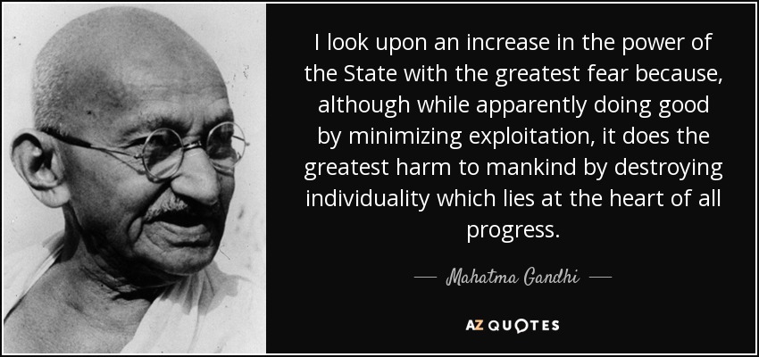 I look upon an increase in the power of the State with the greatest fear because, although while apparently doing good by minimizing exploitation, it does the greatest harm to mankind by destroying individuality which lies at the heart of all progress.