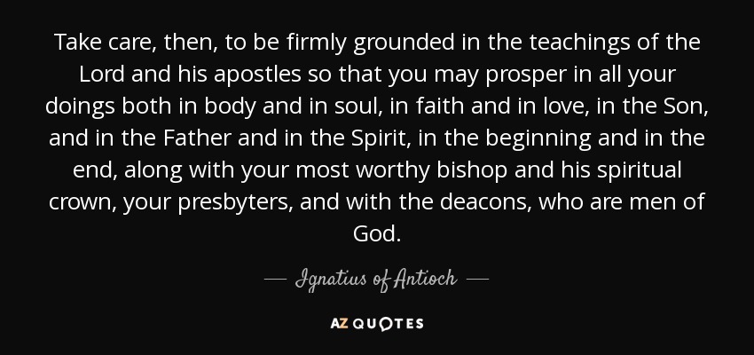 Take care, then, to be firmly grounded in the teachings of the Lord and his apostles so that you may prosper in all your doings both in body and in soul, in faith and in love, in the Son, and in the Father and in the Spirit, in the beginning and in the end, along with your most worthy bishop and his spiritual crown, your presbyters, and with the deacons, who are men of God.