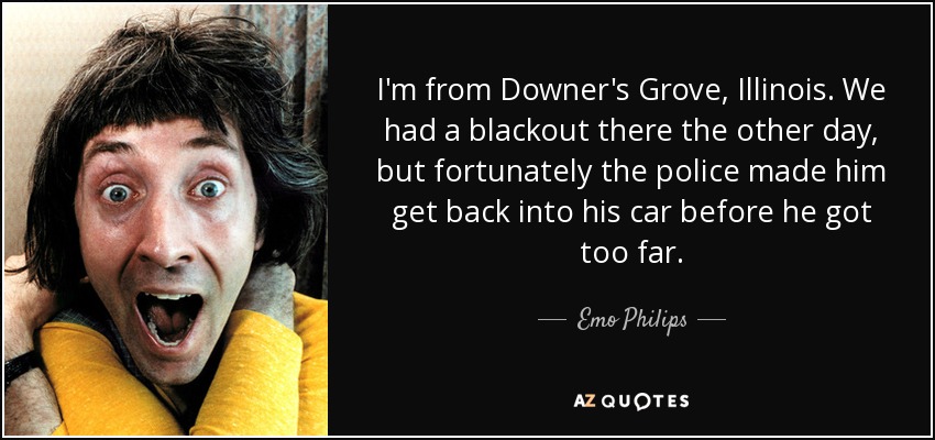 I'm from Downer's Grove, Illinois. We had a blackout there the other day, but fortunately the police made him get back into his car before he got too far.