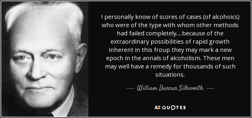 I personally know of scores of cases (of alcohoics) who were of the type with whom other methods had failed completely....because of the extraordinary possibilities of rapid growth inherent in this froup they may mark a new epoch in the annals of alcoholism. These men may well have a remedy for thousands of such situations.