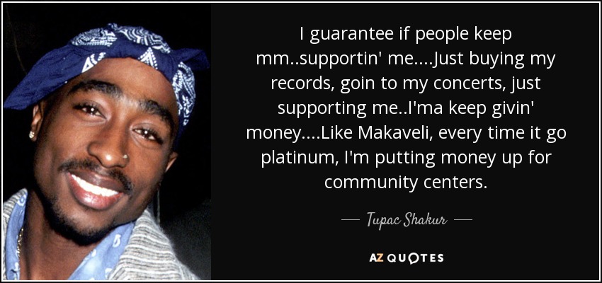 I guarantee if people keep mm..supportin' me....Just buying my records, goin to my concerts, just supporting me..I'ma keep givin' money....Like Makaveli, every time it go platinum, I'm putting money up for community centers.