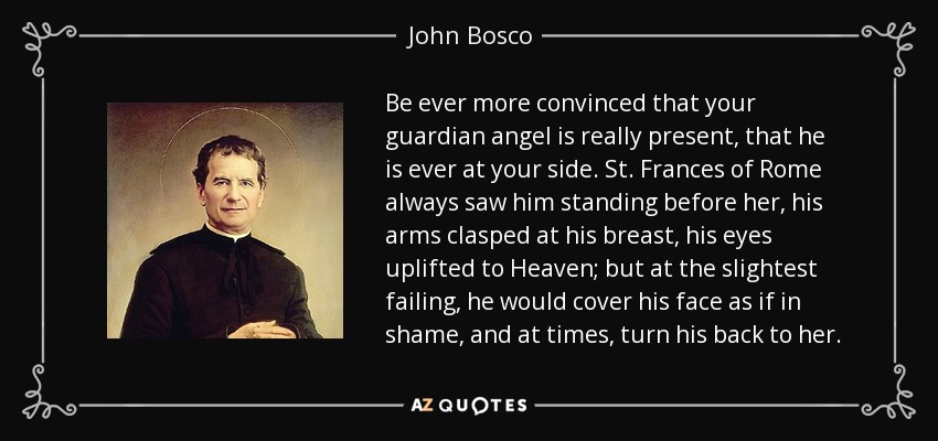 Be ever more convinced that your guardian angel is really present, that he is ever at your side. St. Frances of Rome always saw him standing before her, his arms clasped at his breast, his eyes uplifted to Heaven; but at the slightest failing, he would cover his face as if in shame, and at times, turn his back to her.
