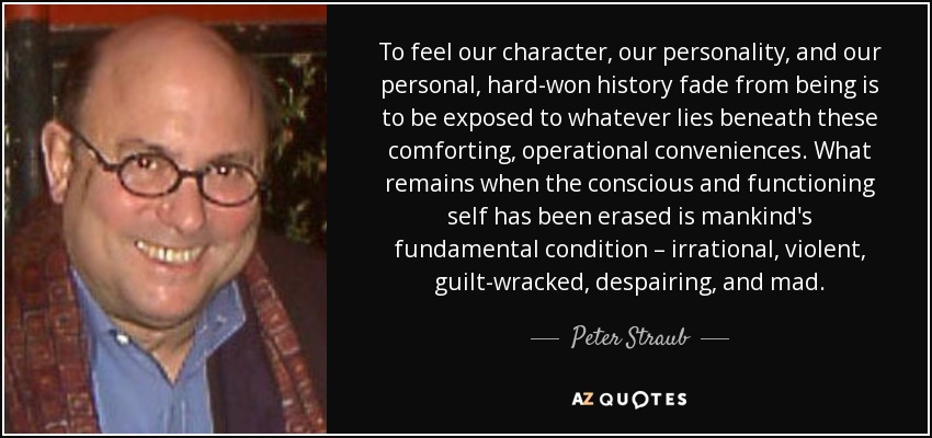 To feel our character, our personality, and our personal, hard-won history fade from being is to be exposed to whatever lies beneath these comforting, operational conveniences. What remains when the conscious and functioning self has been erased is mankind's fundamental condition – irrational, violent, guilt-wracked, despairing, and mad.