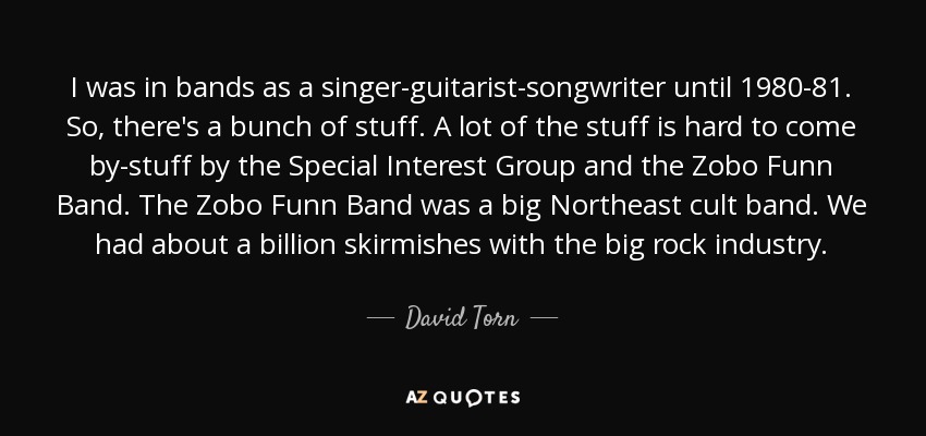 I was in bands as a singer-guitarist-songwriter until 1980-81. So, there's a bunch of stuff. A lot of the stuff is hard to come by-stuff by the Special Interest Group and the Zobo Funn Band. The Zobo Funn Band was a big Northeast cult band. We had about a billion skirmishes with the big rock industry.