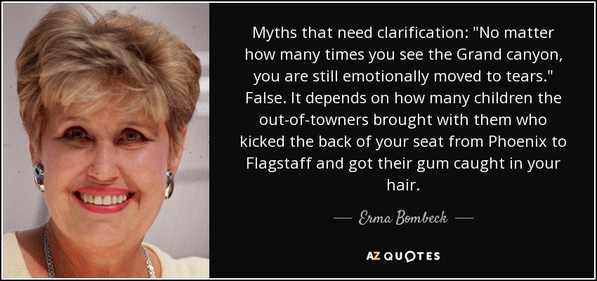 Myths that need clarification: "No matter how many times you see the Grand canyon, you are still emotionally moved to tears." False. It depends on how many children the out-of-towners brought with them who kicked the back of your seat from Phoenix to Flagstaff and got their gum caught in your hair.