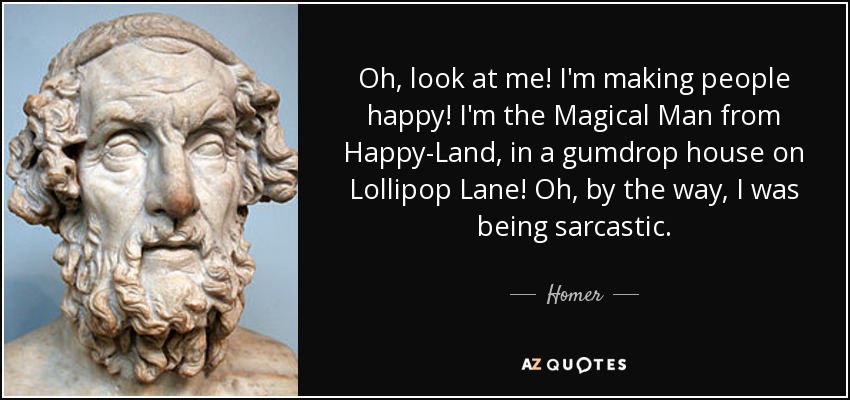 Oh, look at me! I'm making people happy! I'm the Magical Man from Happy-Land, in a gumdrop house on Lollipop Lane! Oh, by the way, I was being sarcastic.