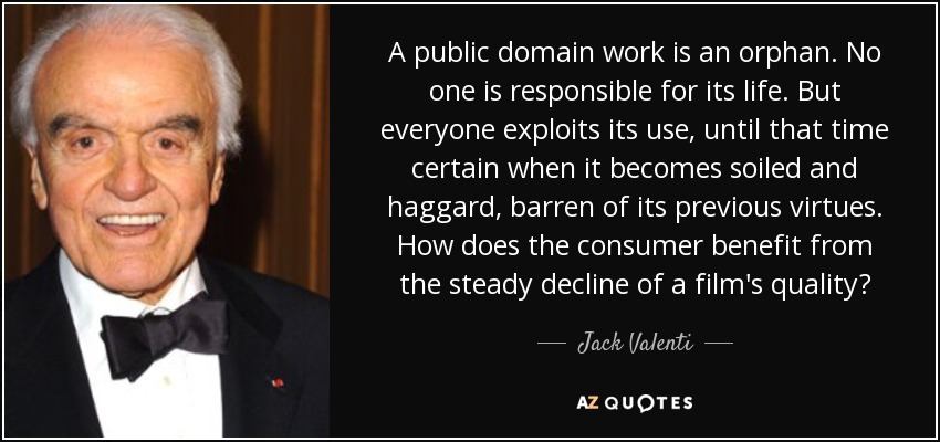 A public domain work is an orphan. No one is responsible for its life. But everyone exploits its use, until that time certain when it becomes soiled and haggard, barren of its previous virtues. How does the consumer benefit from the steady decline of a film's quality?